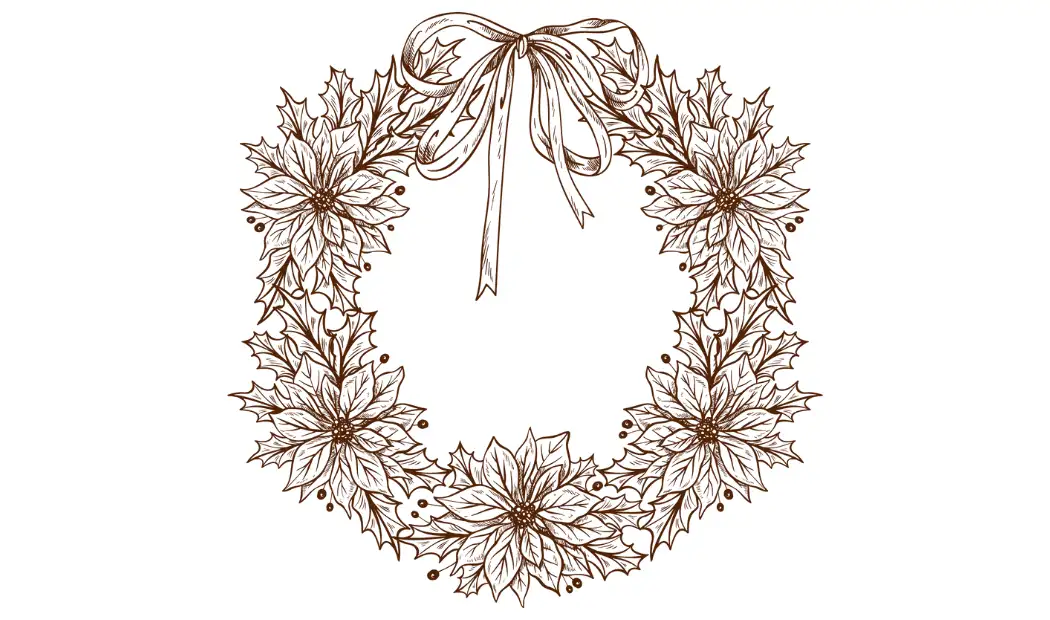 Another elegant element is a Christmas wreath drawing. Wreaths are circular decorations often made with pine leaves, holly, berries, ribbons, and ornaments.