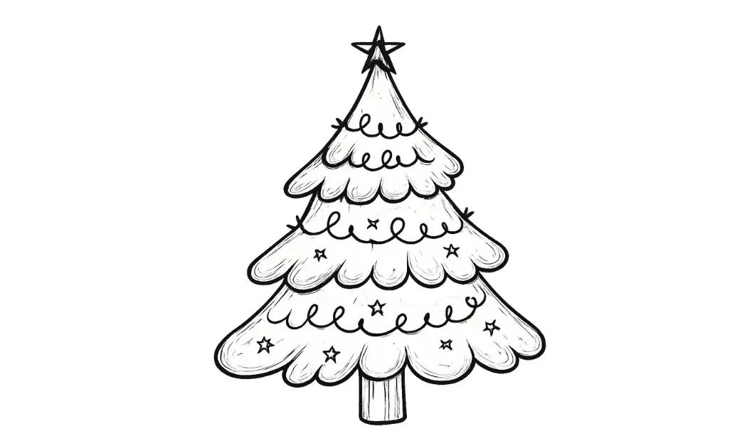 - Tips: Start with a triangular outline, then layer branches using zigzag or wavy lines. Add small ornaments and a bright star at the top to make it festive.