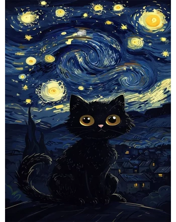 Whimsical black cat under a starry night